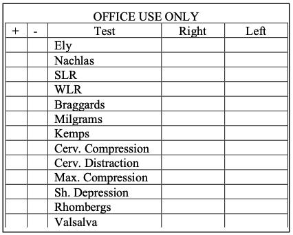 A chiropractic examination will be performed which may include spinal and physical examination, orthopedic and neurological testing, palpitation, specialized instrumentation, radiological examination (x-rays), and laboratory testing.